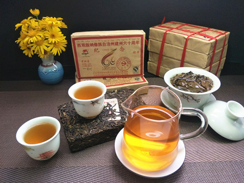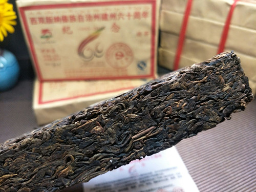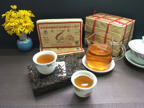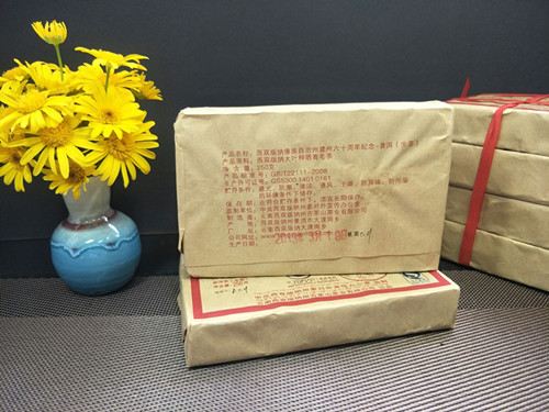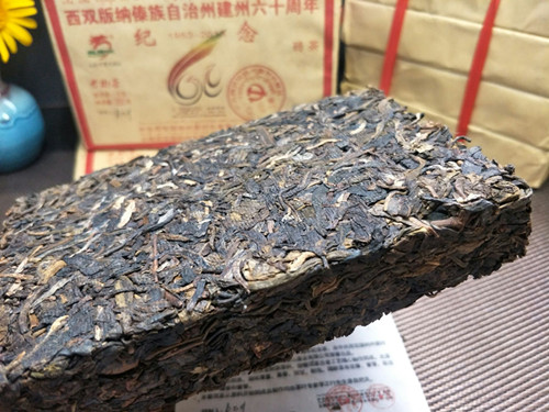 【特点】本片普洱茶是西双版纳傣族自治州建州六十周年纪念茶,由中共西双版纳州委对外宣传办公室监制、云南西双版纳州古茶山茶业有限公司荣誉出品。每片普洱茶从原料开始到成品制作均有茶叶专家李正行先生亲自把关。特选十三个山头老树茶原料,按普洱茶古老工艺精心制作而成。茶砖芽叶肥大,条索清晰油亮,开汤后汤色黄亮光泽,口感回甘生津,滋味厚重,茶气浓烈,汤香清扬。回甘快,口感层次多。高香且耐泡,叶底完整,有韧性。
