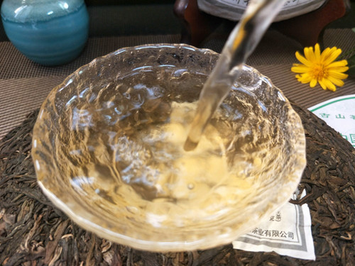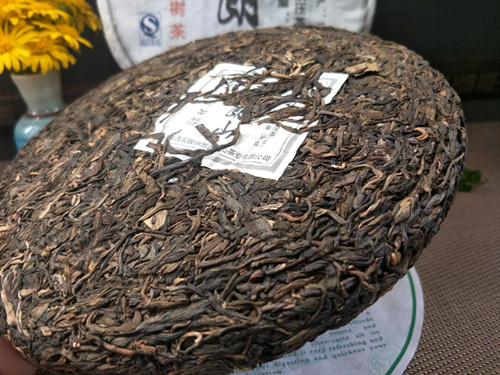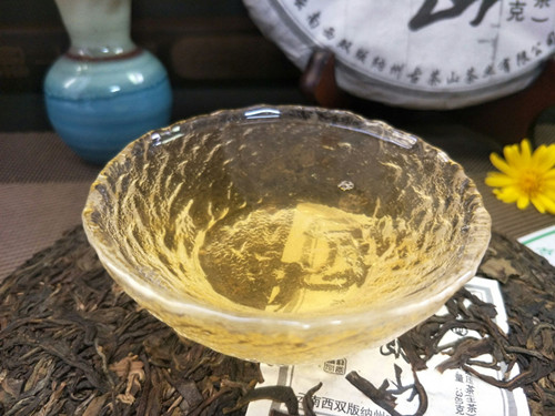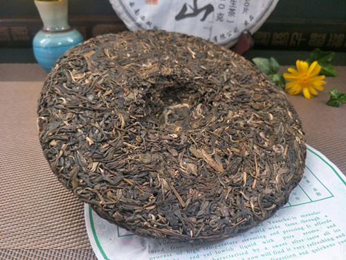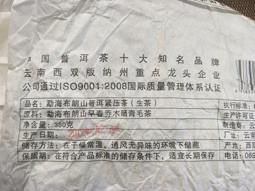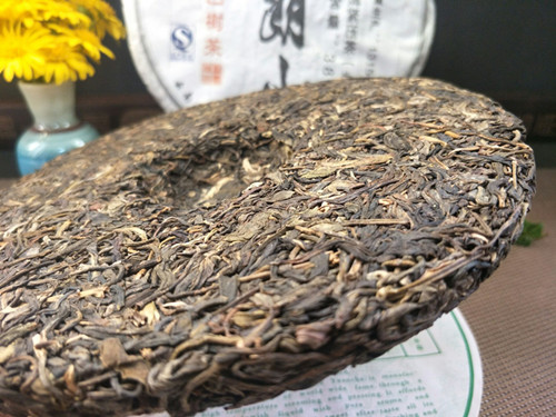 【茶品特点】 选用的是勐海布朗山乔木古茶树的鲜叶为原料,采用手工传统工艺方法制作出晒青毛茶,后经高温蒸压制成,茶饼叶片条索肥壮、厚实。色泽乌绿,带有明显的晒青味道。用料较细,大约3到4级鲜叶,没有老梗或茶果等夹杂物。叶片表面白毫显露,润泽度高。汤色金黄,口感醇厚、茶气很足,生津、回甘颇佳。初闻香气不高但随着茶汤入口,清幽的香气顺着上颚进入鼻腔,使人有愉悦的感觉。咽下茶汤时很滑很顺畅,对喉部没有刺激感。香气和回甘在口腔中持久不散,后韵颇佳。