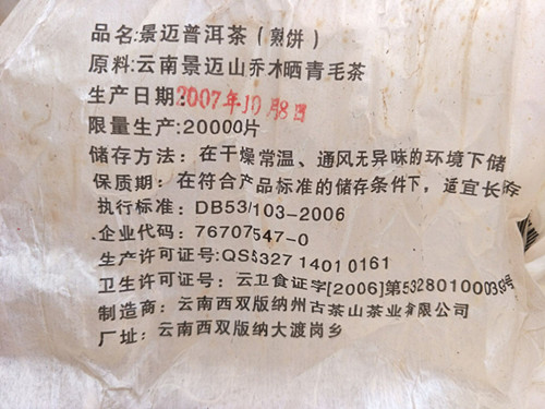 【产品名称】:2007年龙园号 景迈茶 限量版 带收藏编号 纪念熟饼