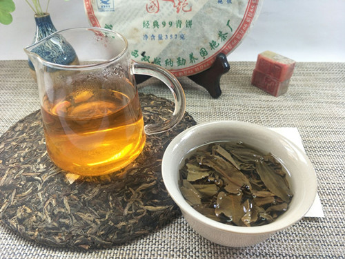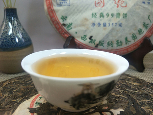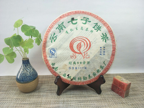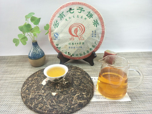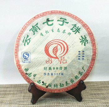 【产品特点】在2007年原料紧缺的情况下,勐养国艳茶厂推出了大家盼望,等待已久的经典系列精品,国艳经典99青饼选用云南勐海早春生态乔木大叶晒青茶为原料。经严格筛选精拣,采用传统工艺精制而成。茶饼规整,条形清晰,肥壮厚实,紧结显毫,冲泡后汤色明亮透黄,茶香浓郁,口感顺滑,生津回甘,韵味十足,久泡余香的特点。现品或继续久藏都为上佳选择。2007年中国(上海)茶业博览会金奖,是一款品饮和收藏价值都很高的特色普洱茶品!