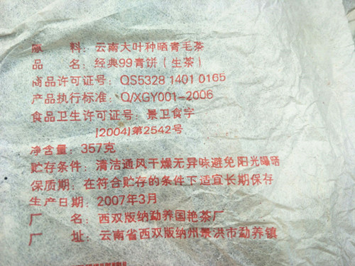 【品 名】2007年国艳 经典99青饼 乔木生态茶