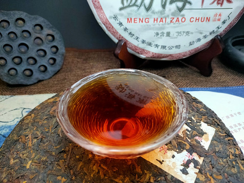 【产品简介】本款勐海早春熟茶七子饼精选勐海茶区早春茶,采用传统工艺压制而成,饼型周正,色泽油亮呈红褐色,金豪显露,汤色红浓明亮,口感陈香浓郁并带有显著的勐海口味,顺滑爽口,回甘持久,是一款值得品饮与收藏的佳品!