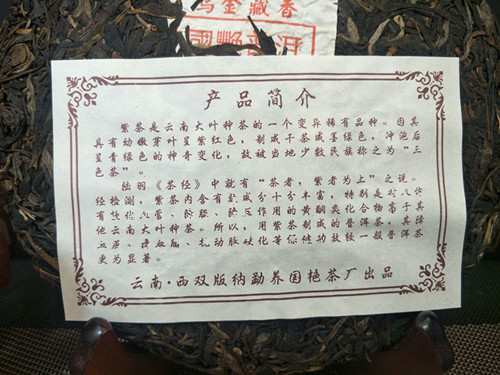 紫茶是云南大叶种茶的一个变异稀有品种。因其具有幼嫩芽叶呈紫红色,制成干茶成墨绿色,冲泡后呈青绿色的神奇变化,故被当地少数民族称之为“三色茶”。陆羽《茶经》中就有“茶者,紫者为上”之说。经检测,紫茶内含有效成分十分丰富,黄酮类化合物高于其他云南大叶种茶。用紫茶制成的普洱茶,汤色红浓透亮,香气独特,口感润滑,回甘持久。