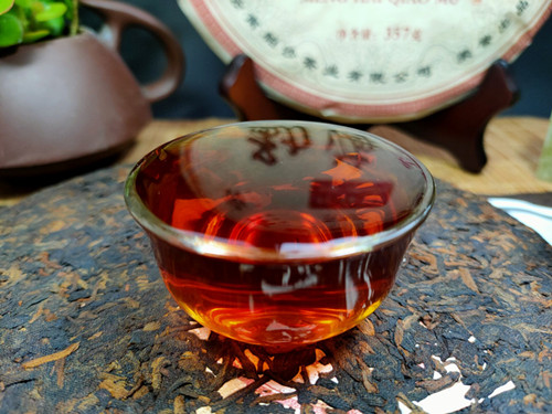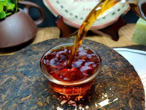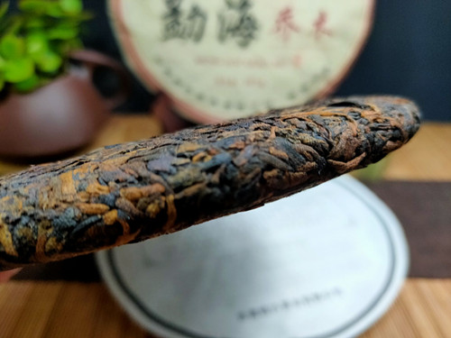 【产品特点】选用勐海茶区大叶种晒青毛茶为原料,遵循传统古法压制而成,外包装古色古香,饼型周正,松紧适中,条索粗壮,金毫洒面,发酵适度,内含物质丰富,汤色红浓明亮,晶莹剔透,香气馥馨,纯正浓郁,口感浓稠柔滑厚重,滋味醇厚回甘,香甜顺滑,耐泡度高。叶底肥厚饱满,富有弹性。品质优良,越陈越香。昆明纯干仓存放,浓浓的陈香口味,值得品饮收藏。